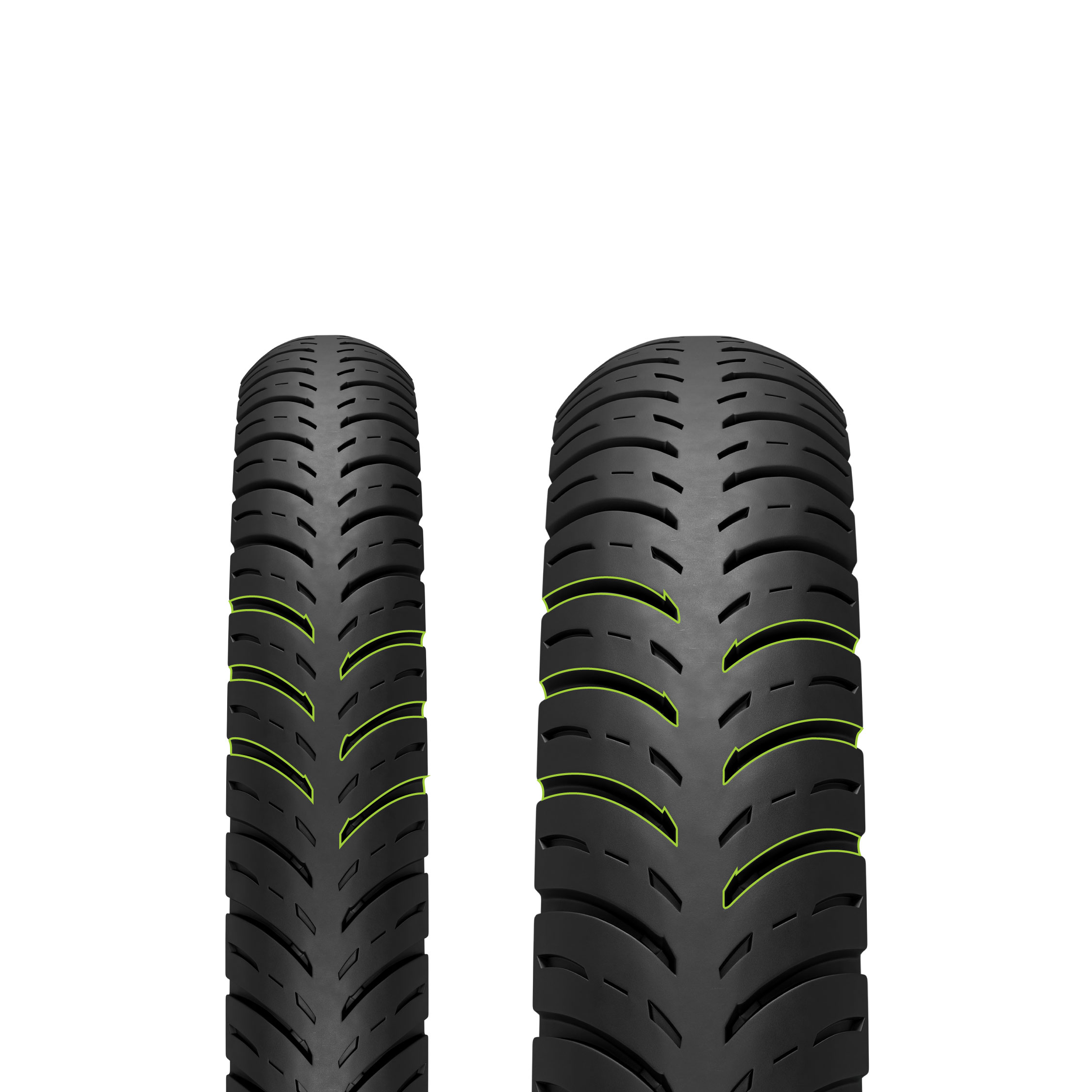 High grip tread compound and multiple staggered sipes: enhances road contact.